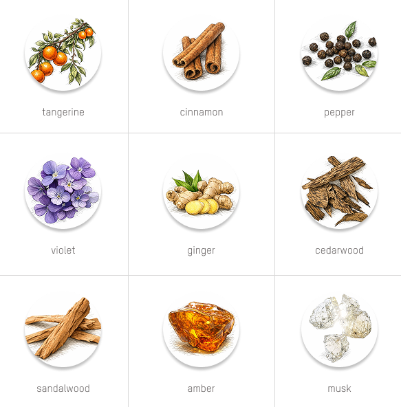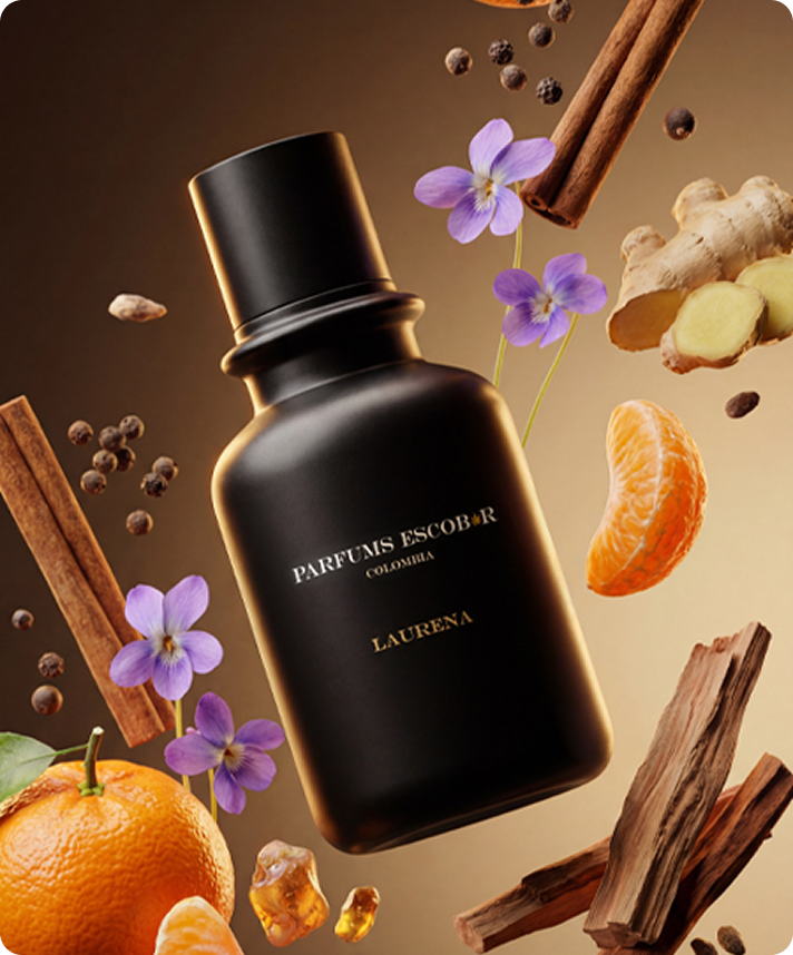 Laurena by Parfums Escobar reveals a captivating balance of warmth, spice, and refined elegance. The fragrance opens with a vibrant burst of tangerine, delicately layered with the warmth of cinnamon and the subtle intensity of pepper, creating an introduction that is both luminous and intriguing. As the scent evolves, the heart unfolds with the graceful softness of violet, enriched by the gentle spice of ginger, adding depth and sophistication to the composition. The experience settles into a rich and sensual base where cedarwood and sandalwood blend seamlessly with amber and musk, leaving behind a warm, addictive trail that lingers with effortless elegance.
