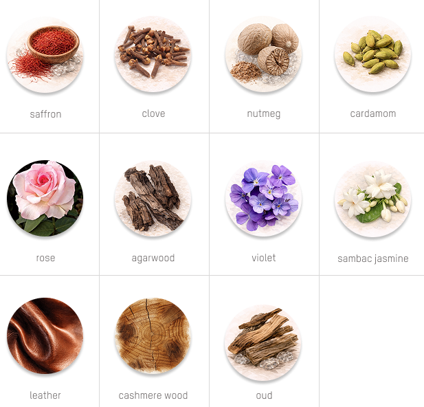 A combination that boasts a blend of saffron, nutmeg and cardamom, deepening into a floral bouquet of agarwood, violet and Sambac jasmine. The fragrance culminates in a rich harmony of leather, cashmere wood and oud. A delightful blend.